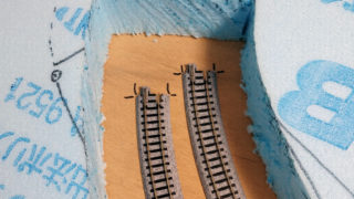 これの続き。3カ月ぶりの工事になりますね。まずは地上部分の直線を少し延長。次に、地下1階部分の線路の先のスタイロフォームに穴を掘って、そこに曲線を延長。で、ここからが本番ですよ。これら2つの端部を将来つなぐために、スタイロフォーム工事を行う...