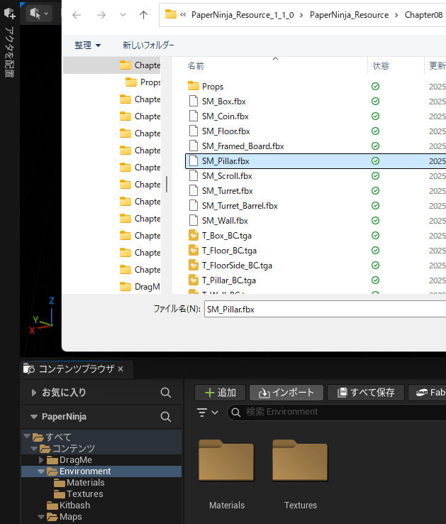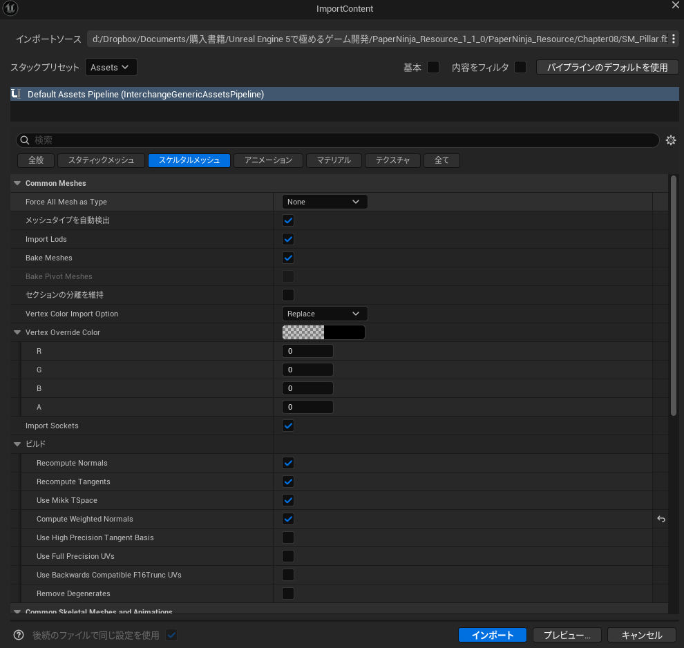 続けて、「第8章 基本的なアセットのインポート」に入る。104ページの一番下から始める。105ページの「インポート」ボタンを押すというところ。本と少し場所が違う。ここ。