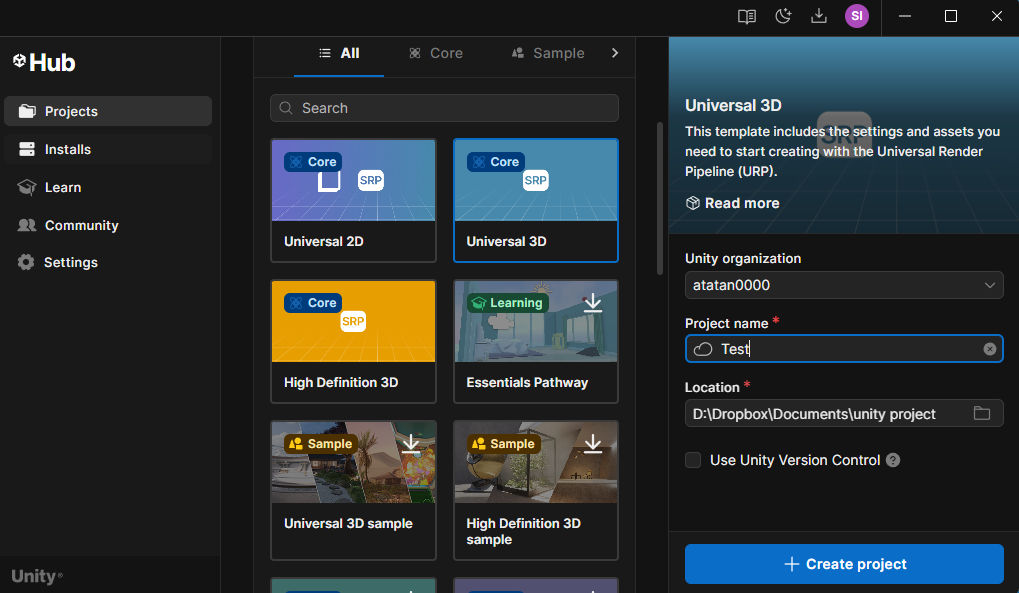 いよいよUnityの操作に入る。まずは36ページ、Universal 3Dのテンプレートを指定する。これ。