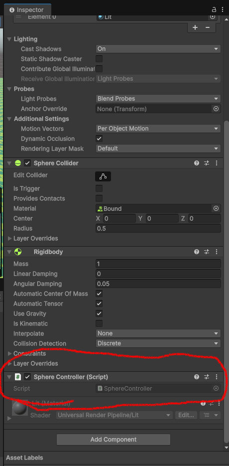 「Sphereを選択して、InspectorのAdd Componentから、SphereControllerを選択する」そうな。