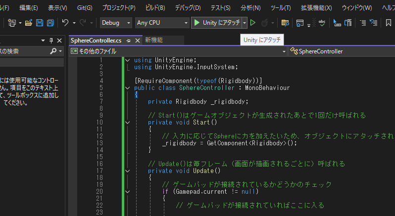 この上のほうにある、「Unityにアタッチ」がミソなのか??