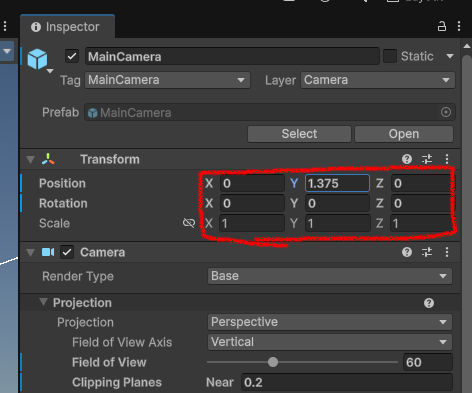それで、本によると、Main Cameraの位置を変更するそうだが、できなかった。これ。