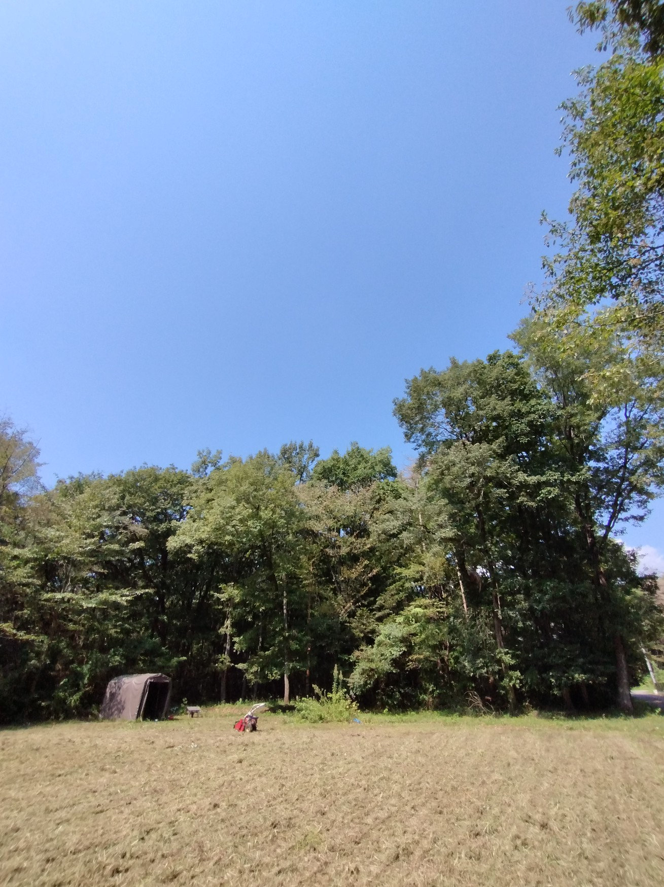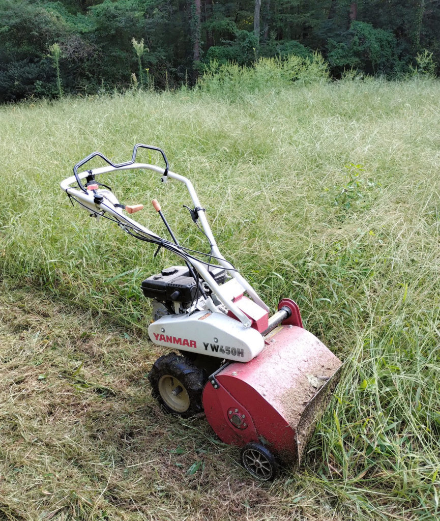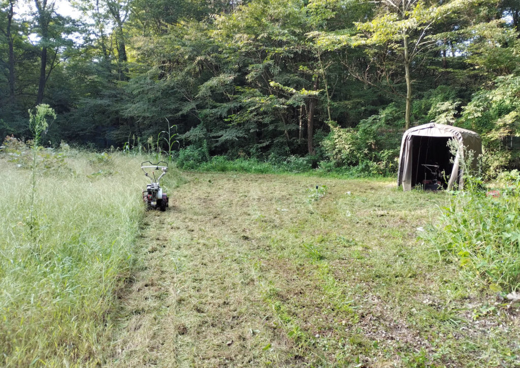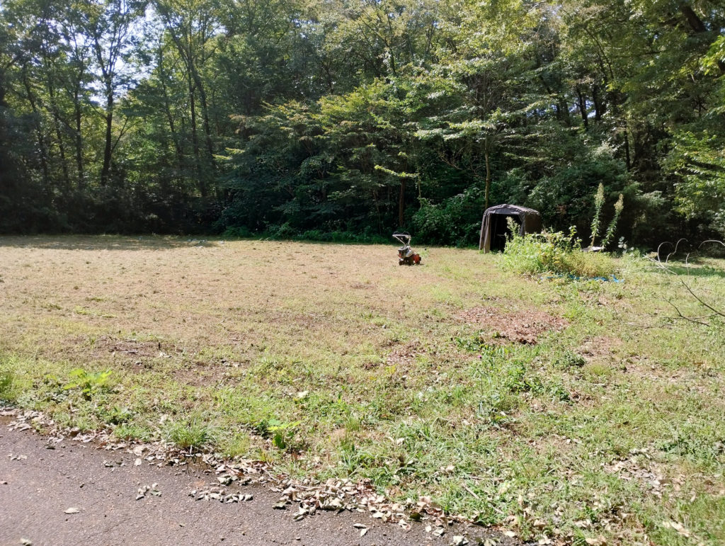 そして、全部やりました。雑草の山みたいなところは、この下にブルーシートが埋まってるので、ハンマーナイフモアでは切れず、刈払機でやらないと・・・