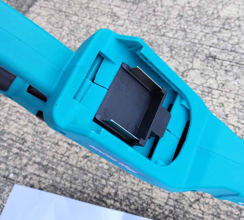 取説も、ほとんど中身がないような記載だけのもの。そこにぶっきらぼうに、電圧21Vと書いてある。そしてコネクタのところを見るとやはり、18Vバッテリーとは違う形状なので、物理的にも接続できない! はい、自動的に21Vの中国製バッテリーを追加でぽちりました。
