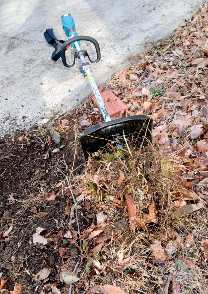 バッテリーがなくなるよりも前に、根が絡まりすぎて動かなくなったので、それをメンテナンスして取る作業から・・・もちろん手では取れないので小さい鎌・・・でも取れないので、少し大きめの鎌でとってみた。こんなふう。