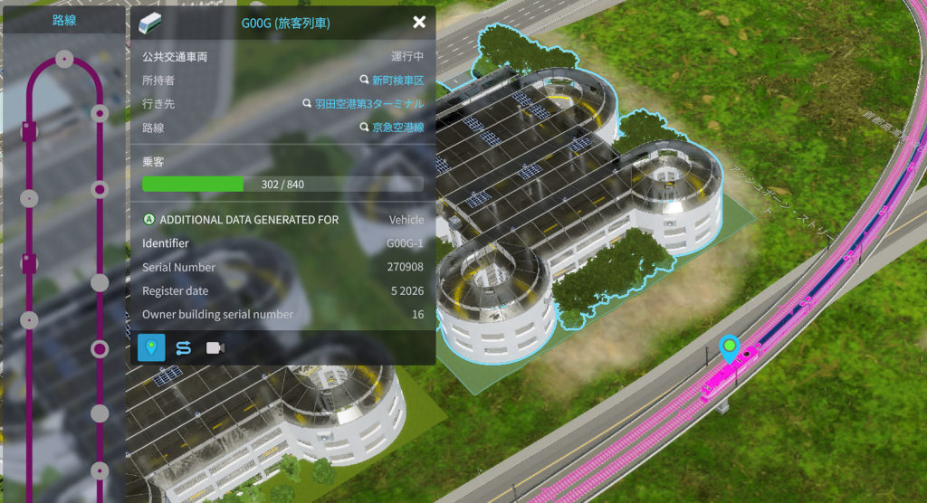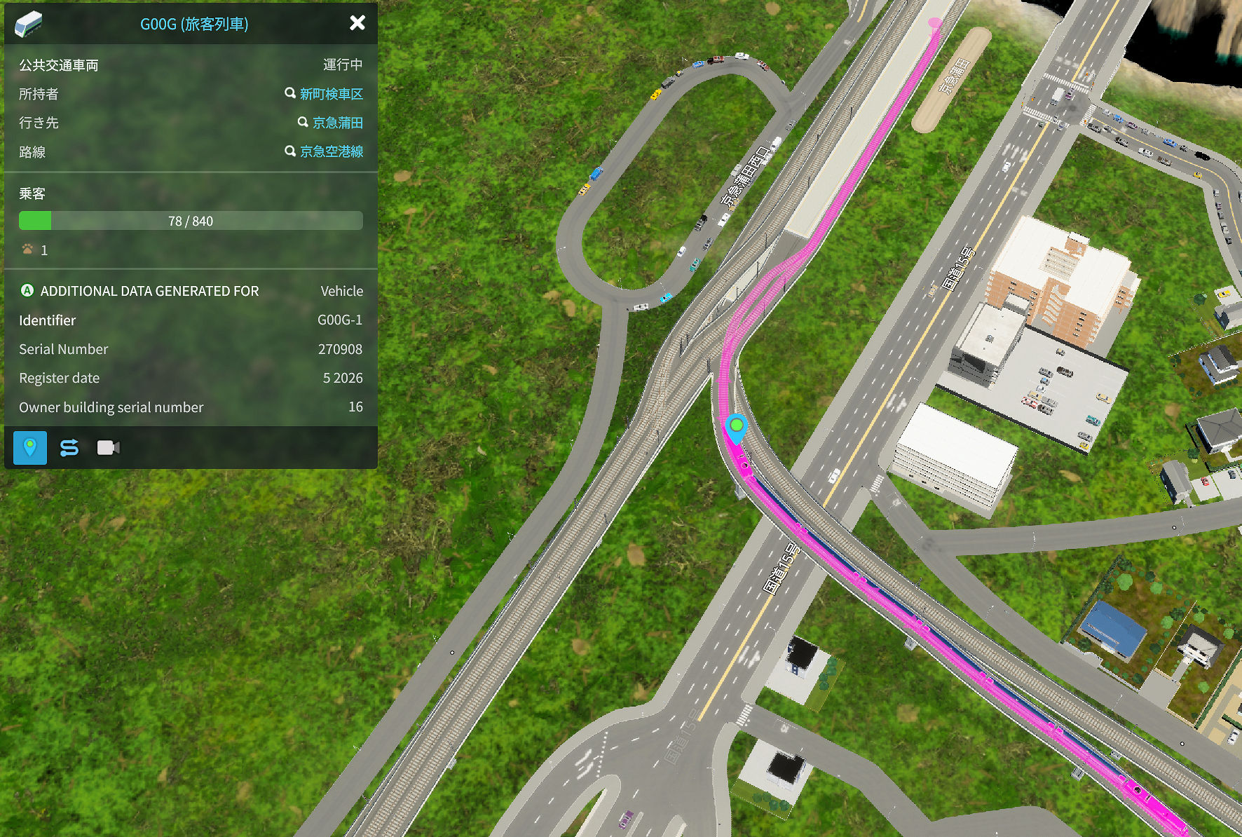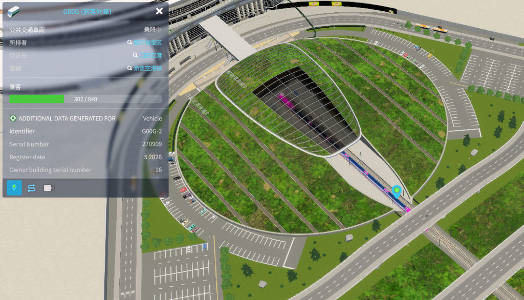 これは途中駅の穴守稲荷到着前の様子。この、Cities Skylines 2の線路の特性?なのか、それともMODを使った駅の特性?なのかは知らないが、勝手に両方向クロスポイントが出来てしまって、いきなり反対車線に入ったり、島式ホームの途中にそのクロスポイントが出来たりしてしまうwwwというしょうもない欠点があって、そういうのを騙しながら遊ばなくてはいけないのは今一。