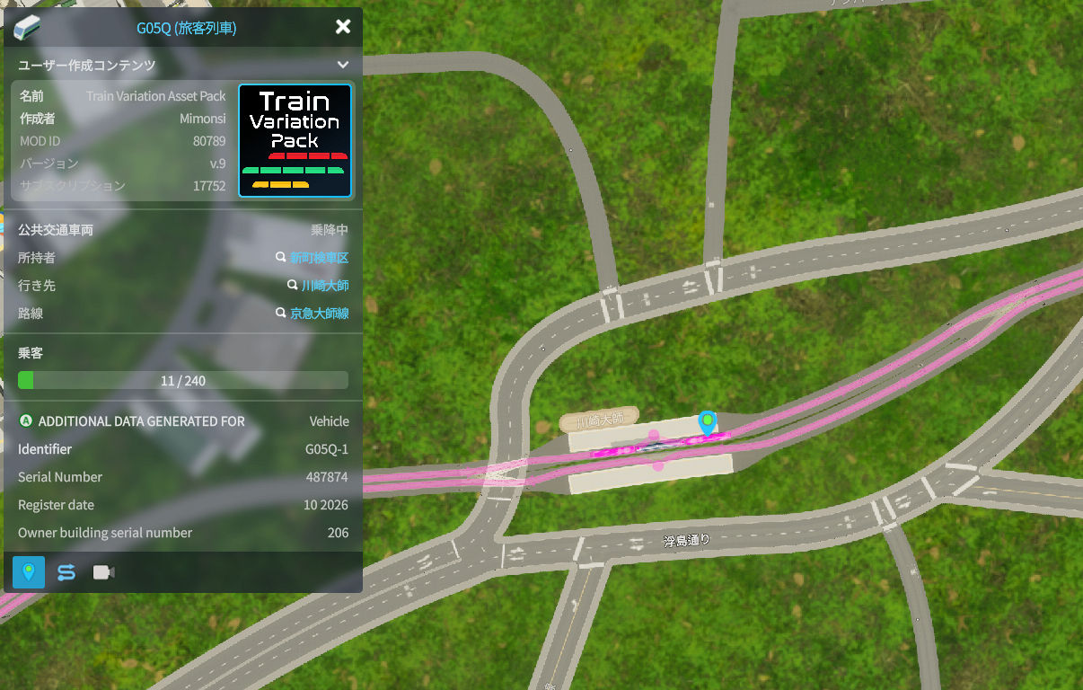 クロスポイント問題は本当に厄介で、特に複数の電車同士がスタックして両方とも消えてしまうのが一番ダメージが大きい。現象を観察していると、車両の編成が長いほど・駅間が短いほど、その被害が大きい。駅間はこういうのを作ってると変えようが無いので、車両の編成を短くするMODを採用してみた。こんな感じですよ。まずは京急大師線。