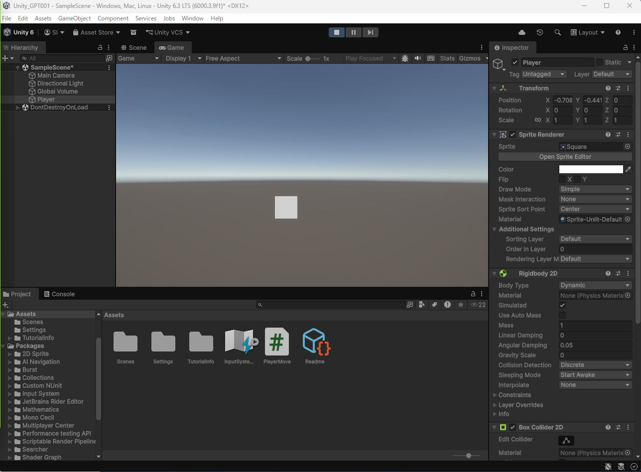 2D画面上で、初めてこの四角い物体を、矢印キー・WASDキーで動かすことに成功。